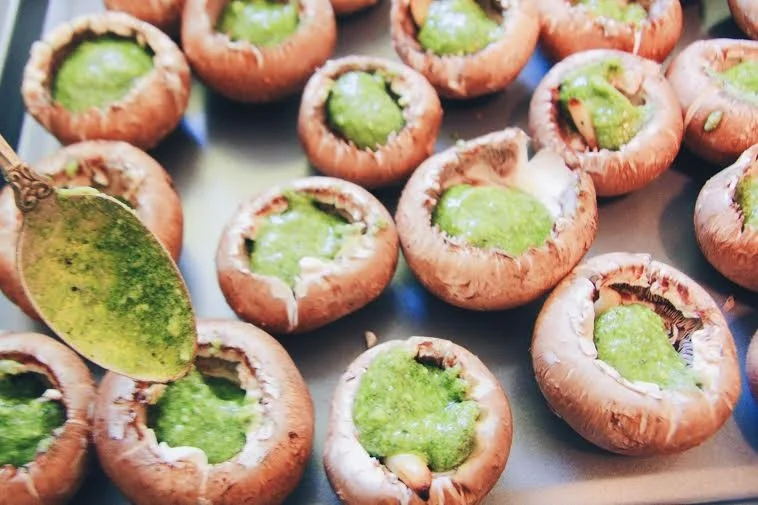Top each mushroom with a dollop of pesto so that the center is about 3/4 full